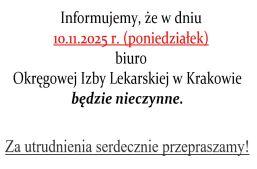 Informujemy, że w dniu 10.11.2025 r. (poniedziałek) biuro Okręgowej Izby Lekarskiej w Krakowie będzie nieczynne. Za utrudnienia serdecznie przepraszamy!