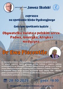 Zapraszamy na kolejne spotkanie w ramach naszego Klubu Dyskusyjnego, którego gościem będzie dr Ewa Piacentile – kobieta o niezwykłej biografii, łącząca w sobie pasję nauki, ducha przedsiębiorczości i głęboką więź z Polską, mimo życia na trzech kontynentach.